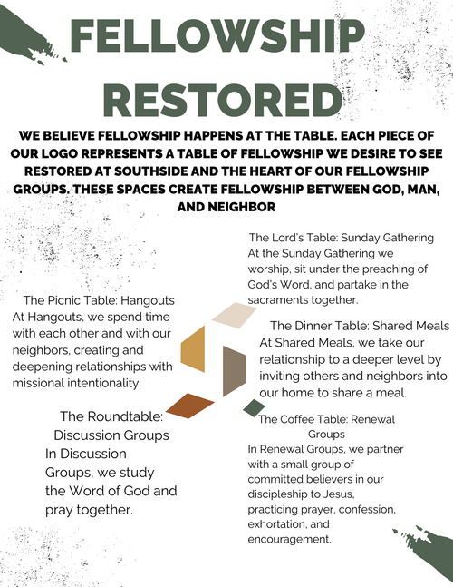 We have five tables of fellowship and ways to engage fellowship with god and neighbor. the graphic below shares more detail on each table at southside.